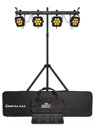Complete wash lighting convenience reaches new heights with 4BAR Flex Q ILS. This all-in-one system is fitted with four par fixtures on one bar. Because 4BAR Flex Q ILS is compatible with the Integrated Lighting System (ILS) that makes creating coordinated light shows across an unlimited number of different fixture types easy and fast, generating synced light shows with DMX is even easier. High-intensity, quad-color (RGBA) LEDs generate a broad spectrum of colors and achieve natural-looking color temperatures with its punchy amber LEDs. 4BAR Flex Q ILS easily sets up and tears down in minutes and includes a handy carry bag. Adding to the unit's versatility are two L-brackets that let you maximize setup possibilities and configurations. Easily mount up to 4 additional fixtures to the top of the 4BAR Flex Q ILS mounts to most tripods or speaker stands, without the need for additional clamps, using the pass-through hole. D-Fi™ USB compatibility for wireless master/slave or DMX control is on-board and multiple control options include standalone, DMX mode, wireless footswitch or the IRC-6.