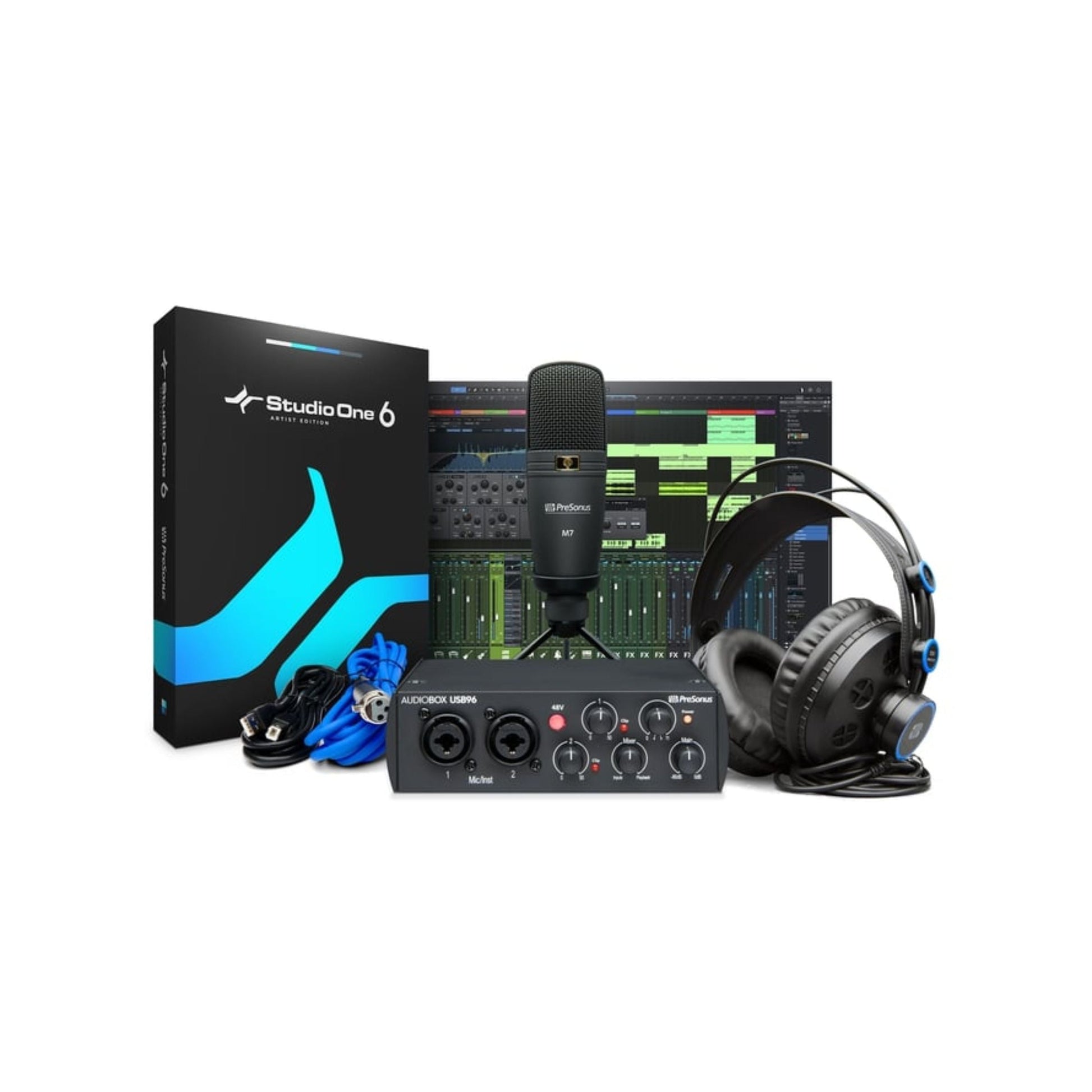 Start recording at up to 96 kHz today with this complete, all-PreSonus package! Record with the ultra-mobile AudioBox USB® 96 bus-powered, 2-channel USB 2.0 audio/MIDI interface and easy-to-use Studio One® Artist DAW software. Capture sound with the M7 large-diaphragm condenser mic and monitor with high-definition HD7 headphones.