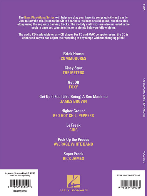 The Bass Play-Along Series will help you play your favorite songs quickly and easily! Just follow the tab, listen to the audio to hear how the bass should sound, and then play along using the separate backing tracks. The melody and lyrics are also included in the book in case you want to sing, or to simply help you follow along. Songs: Brick House • Cissy Strut • Get Off • Get Up (I Feel Like Being) a Sex Machine • Higher Ground • Le Freak • Pick up the Pieces • Super Freak.