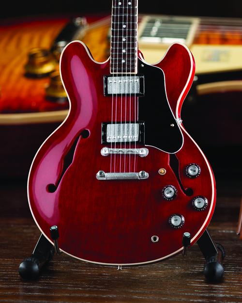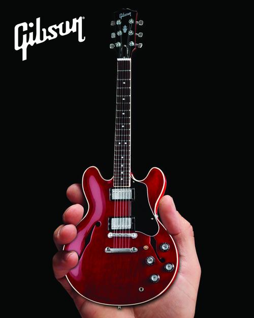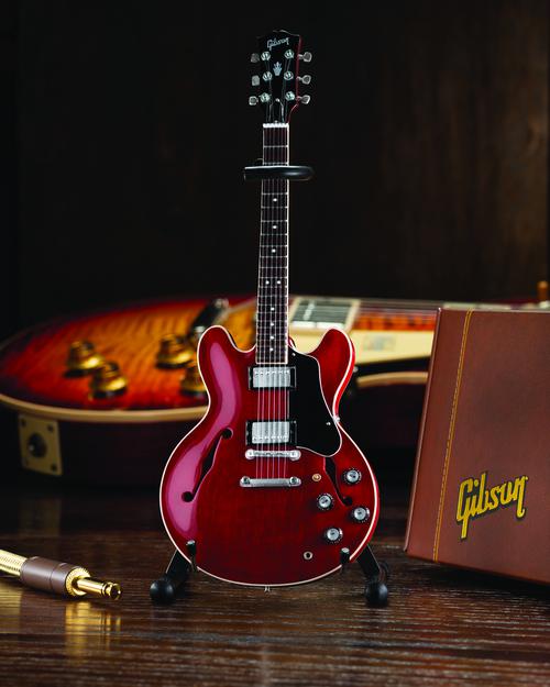 These miniature replica model guitars are officially licensed to commemorate iconic Gibson(TM) instruments. Each 1:4 scale ornamental replica guitar is individually handcrafted with solid wood and metal tuning keys. Each guitar model is approximately 10-inches in length and comes complete with a high-quality miniature adjustable A-frame stand and guitar case gift box. Axe Heaven Miniature Replicas look great, but are not playable.