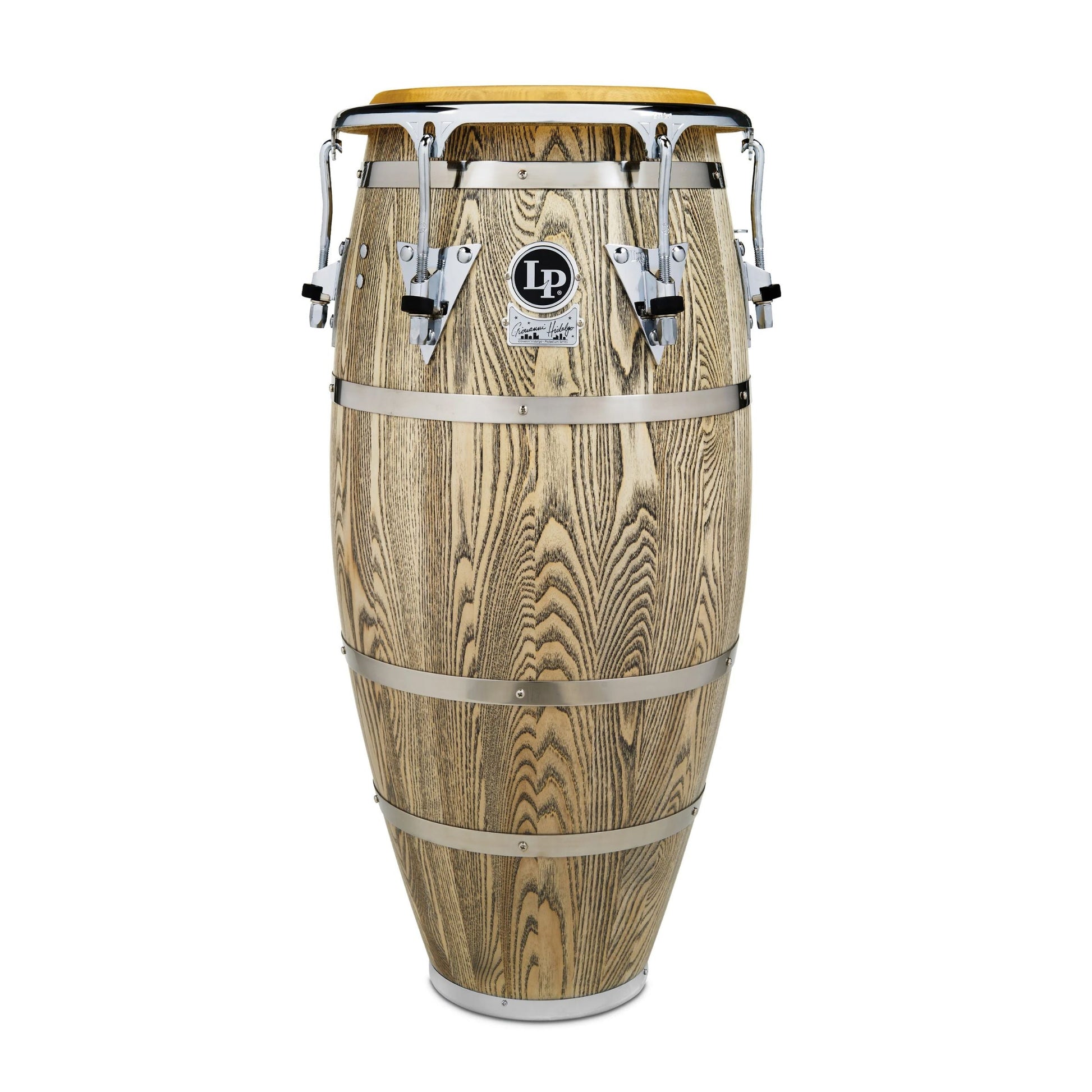 These Giovanni Hidalgo, LP Palladium Congas retro design with unique exterior bands that harken back to the days of the famous NYC Palladium dance hall. These 32" drums are made of 3-ply Premium North American Ash and outfitted with natural rawhide heads. Hardware features include extended Collar Comfort Curve II rims, premium Galaxy hardware with 3/8" diameter tuning lugs, and reinforced LP Heart side plates.