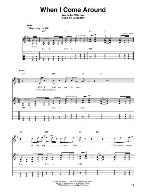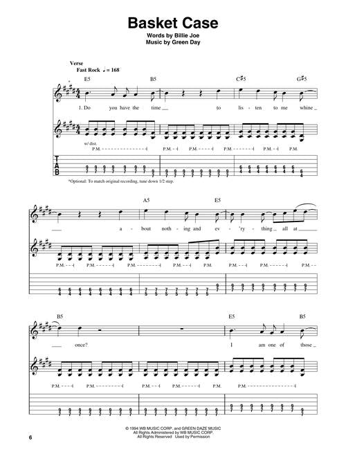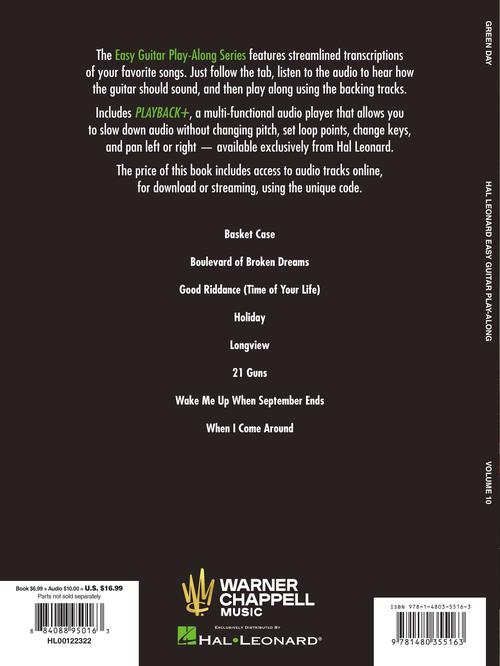 The Easy Guitar Play-Along® series features streamlined transcriptions of your favorite songs. Just follow the tab, listen to the audio to hear how the guitar should sound, and then play along using the backing tracks. This volume features 8 songs: Basket Case • Boulevard of Broken Dreams • Good Riddance (Time of Your Life) • Holiday • Longview • 21 Guns • Wake Me up When September Ends • When I Come Around.