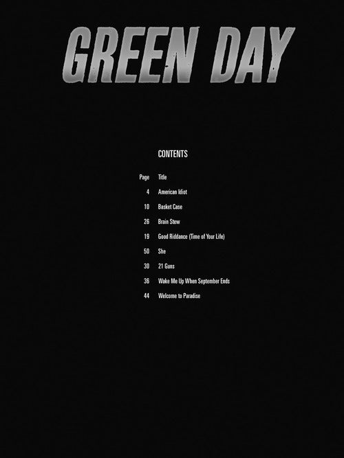 This volume features eight Green Day hits, including: American Idiot • Basket Case • Brain Stew • Good Riddance (Time of Your Life) • She • 21 Guns • Wake Me up When September Ends • Welcome to Paradise.