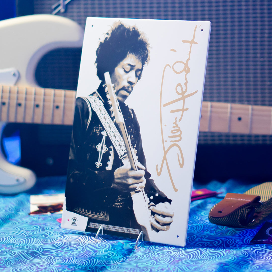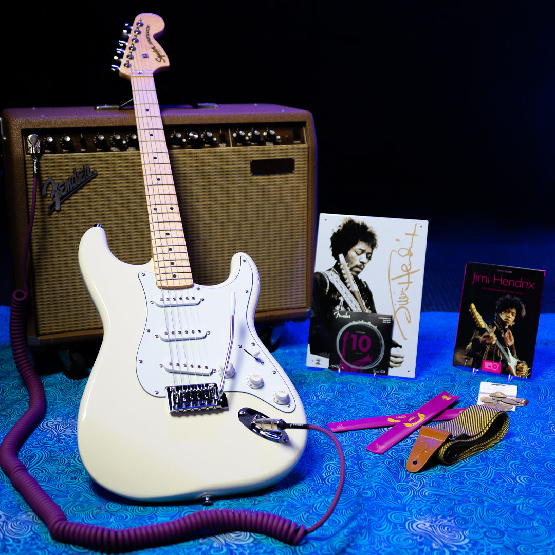 Experience the Hendrix 80th birthday celebration with this Limited Edition Guitar and Accessory bundle. The Accessory Pack features the finest Hendrix themed Fender cable, strings, picks, and strap, as well as a tin sign, logo wristbands, and a colorful book titles Stories Behind Every Hendrix Song. The guitar is the classic Fender Affinity White Olympic Stratocaster (#1073508). Items also sold separately.