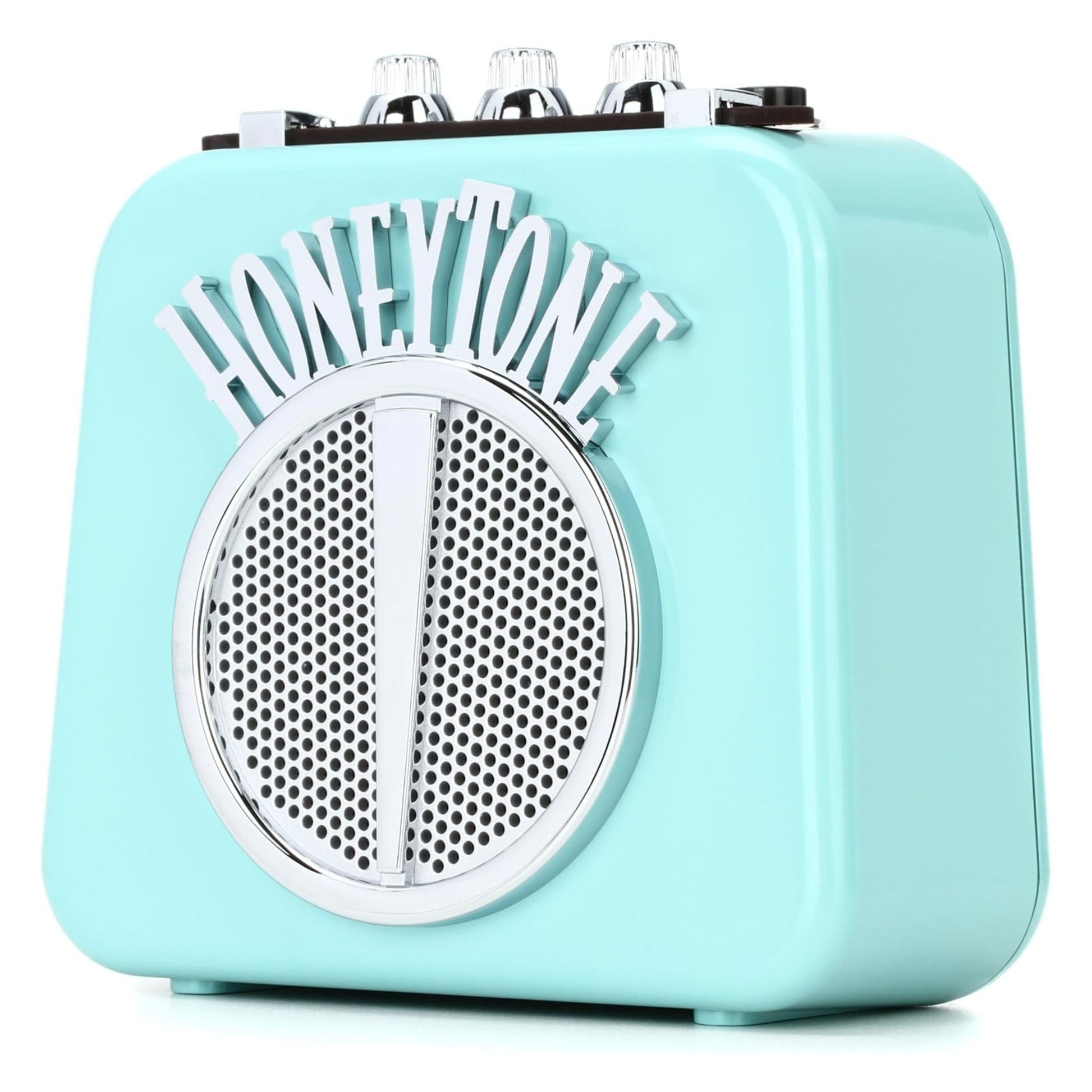 The Honeytone N-10 Guitar Mini Amp from Danelectro is a pint-sized 1.5W combo amp packs surprising punch and a wealth of useful features for guitarists on the go. Measuring just 5.5" x 3.5" x 2.5", the N-10 slips easily into any gig bag or backpack, ready to provide crisp, full-range tone at a moment's notice. An integrated belt clip and leather handle make the amp easy to transport wherever inspiration may strike. The Honeytone N-10 amp is powered by 9-volt battery (included) or a Danelectro DA-1 adapter.