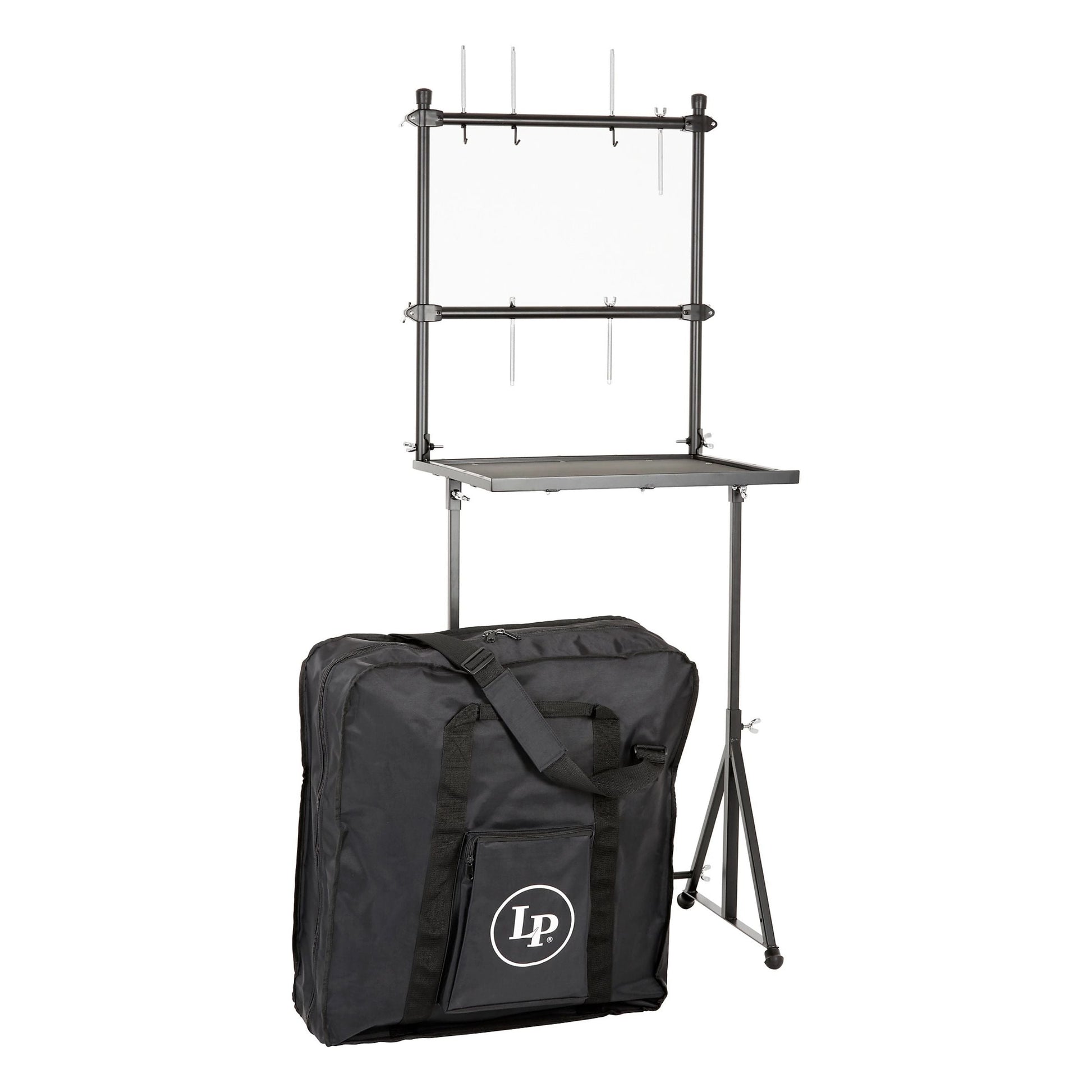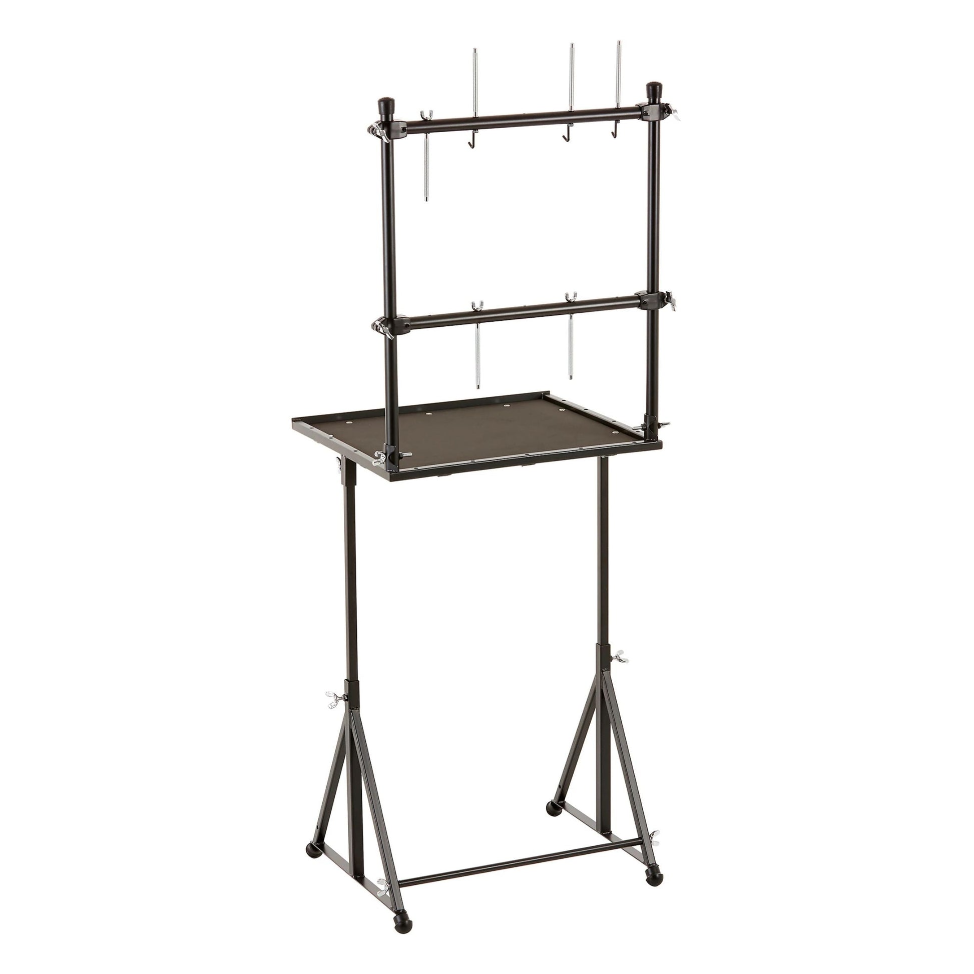 A collapsible table designed to help percussionists add sounds while staying organized. The ideal percussionist's workstation for live and studio performances, this collapsible table features a multitude of options for complete customization of mounted percussion and keeps all of your hand percussion items organized and immediately ready for use.