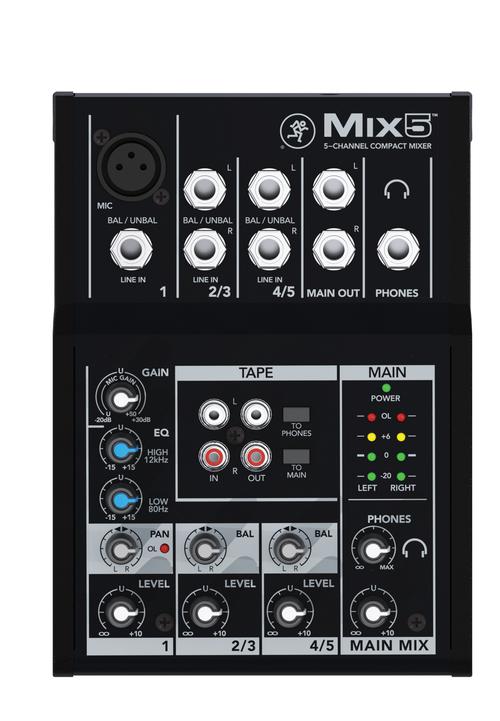 The Mix5 5-channel compact mixer is reliably rugged, with the proven quality you expect from Mackie, the world leader in compact mixer design. Perfect for straightforward applications that incorporate a single mic with other sources, Mix5 sounds great and maintains audio quality from any source. Plus, with a rugged metal chassis and high-quality components throughout, Mix5 is a solid investment in reliability. An amazing value, Mix5 is extremely easy to use and delivers the sound quality you need in a rugged design built to last. Plus, wouldn't you rather mix on a Mackie? Don't sacrifice: choose the Mackie Mix Series.