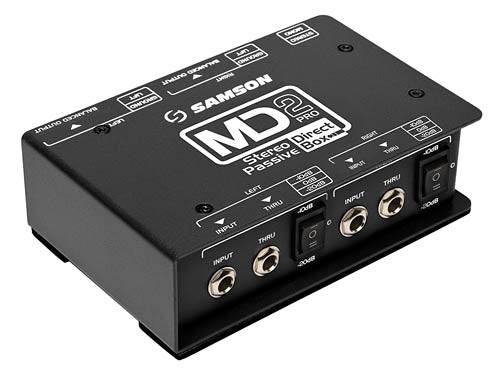 Samson's MD2 Pro Stereo Passive Direct Box combines two premium direct boxes in a single case. Rugged, roadworthy construction and two shielded transformers provide high-quality signal connection solutions for a variety of live sound and recording applications. The MD2 Pro is perfect for converting unbalanced stereo line level or instrument signals from keyboards, electronic drum kits, acoustic-electric guitars and more. Features include: