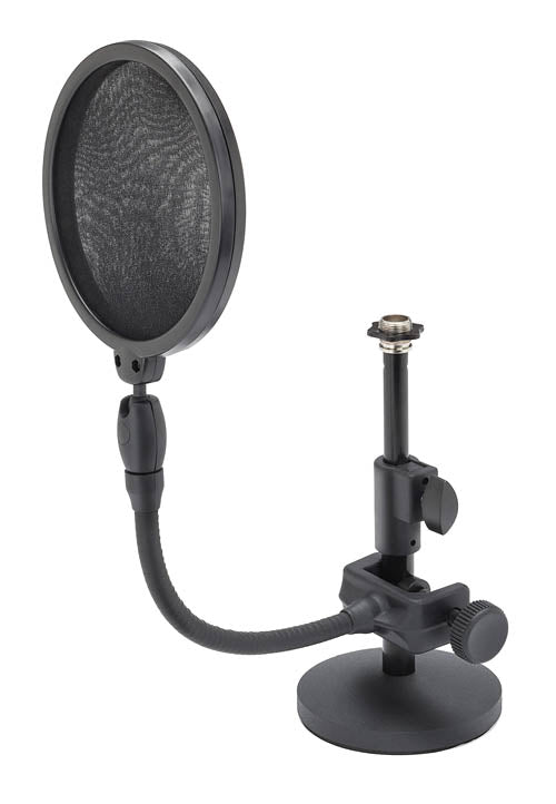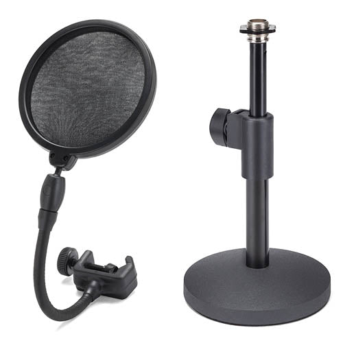 The Samson MD2/PS05 Bundle is an essential mic accessory pack for any desktop studio used for vocal recording applications such as podcasting, voiceover work, music tracking and more. Via a telescoping arm, the MD2 Desktop Microphone Stand is easily adjustable from 6-8″ in height to allow for optimal, as well as versatile, desktop mic positioning. While it's low-profile design fits unobtrusively on desktops, the MD2 offers a weighted die-cast metal base (4″ width) to ensure stability to any microphone with a standard mic clip (5/8″-27 threading). The PS05 Microphone Pop Filter features a dual-layer 4.75″ nylon mesh screen that reduces the vocal popping sounds (“P-Pops”) that occur during speech and singing, as well as protects the microphone from saliva. Once attached to any standard mic stand shaft or boom by the included C-clamp mount, the PS05 can be easily positioned to preference via an extra durable 7.25″ gooseneck. Additional fine-tune positioning is made possible by the filter's ball joint mount, which offers 360-degree filter rotation.