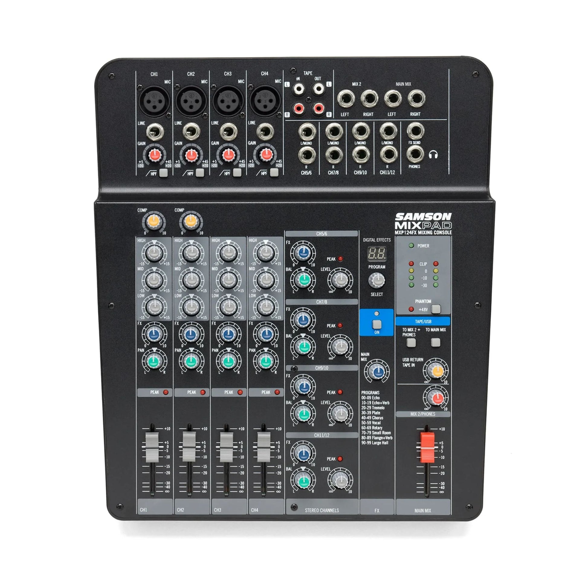 The MixPad® MXP124FX is a compact, 12-input analog stereo mixer with effects and USB that demonstrates Samson's commitment to quality, affordability and professional specifications. This lightweight mixer delivers the sonic clarity, ease-of-use, and premium performance that serious musicians demand.