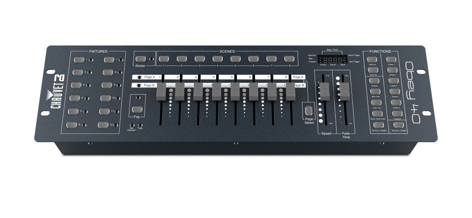 The Obey 40 is the next step up from the Obey 10, allowing for control of up to 12 fixtures at 16 channels each. With a slightly larger size comes a larger capacity: the Obey 40 has 30 banks on 8 scenes, or up to 240 scenes. The Obey 40 offers the flexibility of its little brother but also adds fog and strobe control and MIDI compatibility.