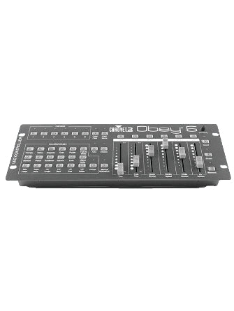 Obey 6 is a universal, compact controller capable of controlling up to 6 channels per fixture. It allows you to control effects by simultaneously operating each fixture in different playback modes, with variable fade times. Increase flexibility with playback options that include manual RGBAW+UV, automated and sound-activated mode. Increase control with adjustable audio sensibility, strobe, and blackout effects.