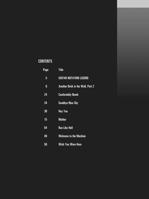 8 songs: Another Brick in the Wall, Part 2 • Comfortably Numb • Goodbye Blue Sky • Hey You • Mother • Run like Hell • Welcome to the Machine • Wish You Were Here.