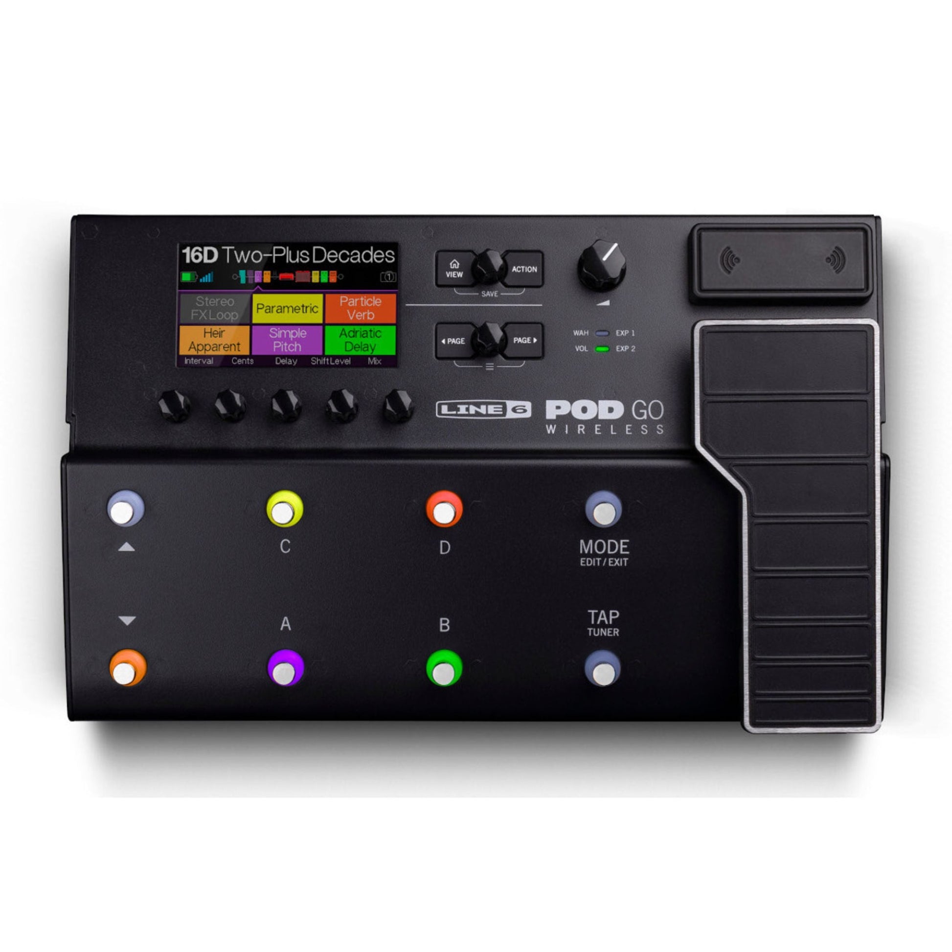 POD Go Wireless enables a simple and intuitive workflow. Choose, edit, and control sounds using the color LCD screen, five push encoders, eight rugged footswitches, and a cast-aluminum multi-function expression pedal—and add two external footswitches or a second expression pedal for even more real-time control. All the essential audio connections are at your fingertips, too, including balanced stereo outputs, a duplicate amp out that can be tapped before the Cab/IR, a stereo effects loop, a headphone jack, and even a USB port for accessing the 4-in/4-out audio interface with re-amping.