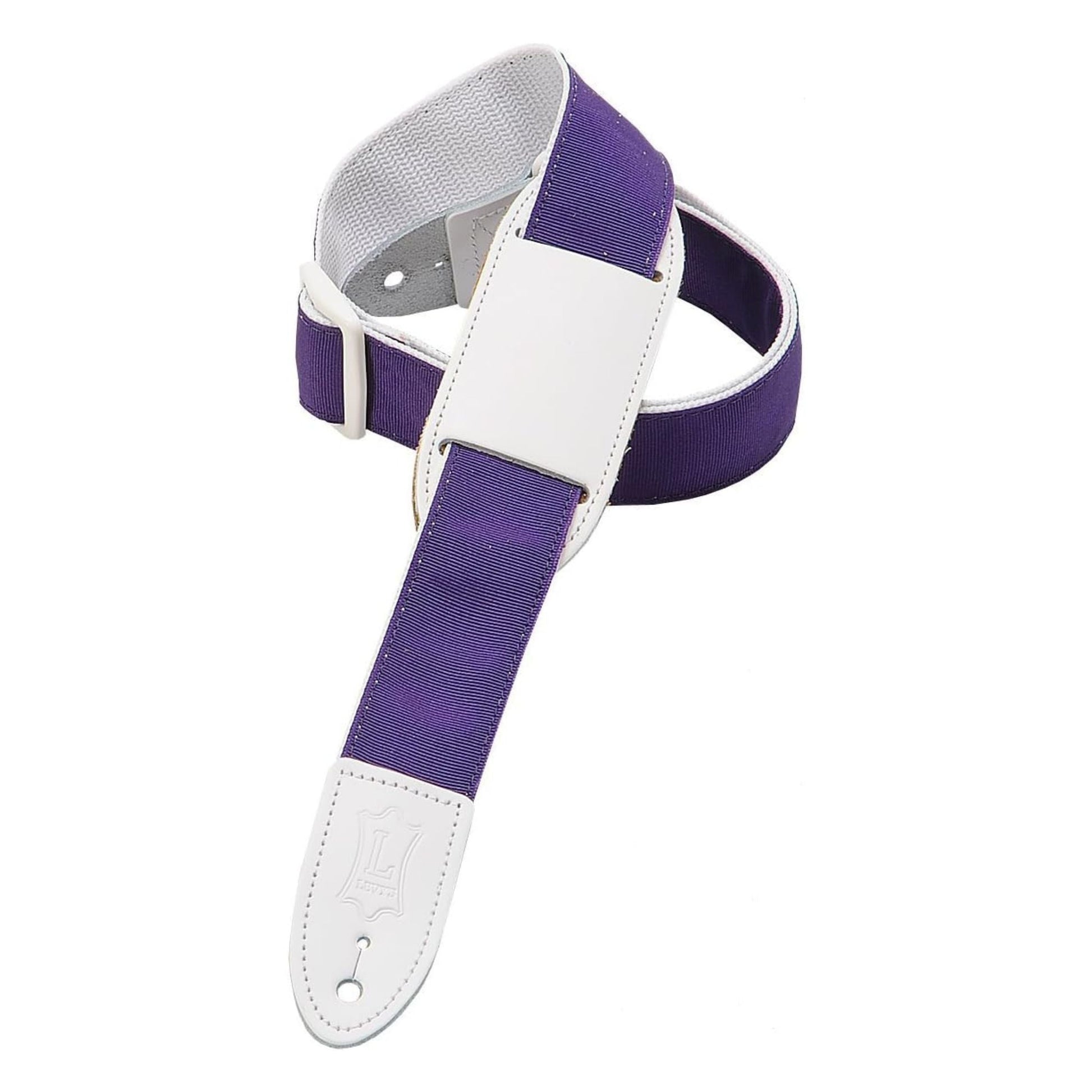 This 1-1/2″ purple ribbon strap with white trim for guitar or ukulele features polypropylene backing, a moveable leather pad, genuine leather ends, and tri-glide adjustment up to 38″ in length.