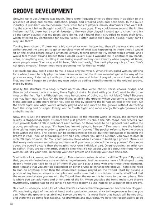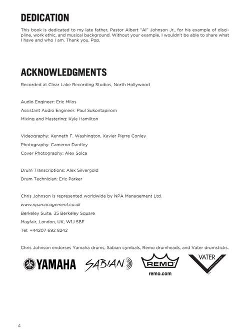 Welcome to your one-stop-shop for learning how tune your chops to pop, R&B, and gospel drumming! This unique book/video/audio combo is the ultimate guide to developing grooves, improvisation, and technical mastery within modern music styles and settings. Chris Johnson has been one of the top in-demand drummers in the music industry for the last 20 years. His recording and touring credits range from pop icons such as Stevie Wonder, Madonna, Jennifer Lopez, Lady Gaga, and Rihanna to R&B singers Patti LaBelle, Mya, Lalah Hathaway, and Fantasia along with gospel artists Donnie McClurkin, Norman Hutchins, and Beverly Crawford. In this book, Chris gives advice for playing techniques and approaches, and sharing of experiences of playing in both live performances and studio sessions. In addition to Chris's insights and instruction, the accompanying videos and audio tracks showcase Chris playing to pop hits along with original music and arrangements played by his band. We've even included bonus material featuring interviews with other industry professionals! The three-plus hours of video content is accessed online using the unique code in each book.