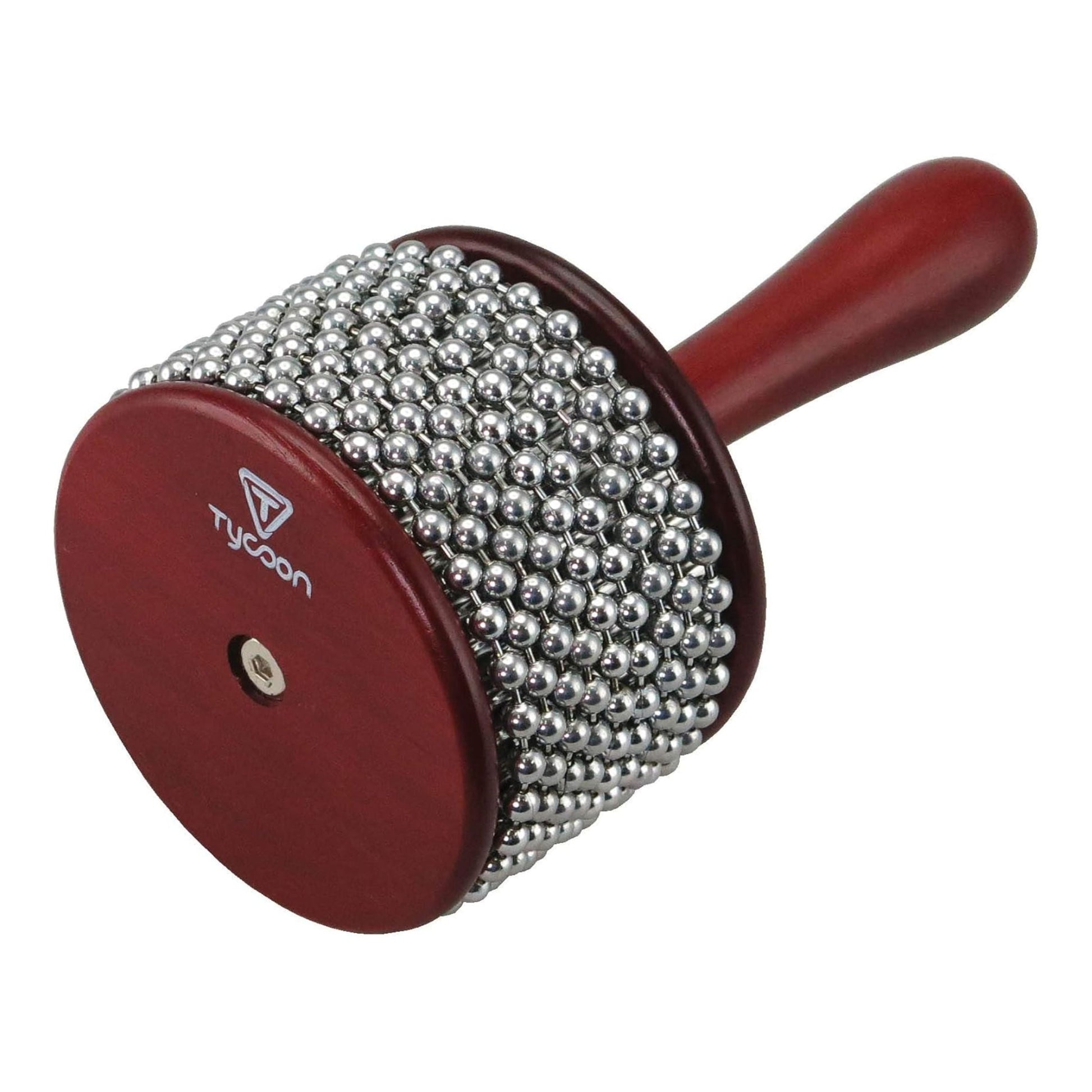 This cabasa is constructed with a ridged stainless steel shell surrounded by loops of steel-bead chains, producing rhythmic shaking and rattling sounds. Wooden flanges enclose the steel cylinder with a wooden handle attached to the bottom.