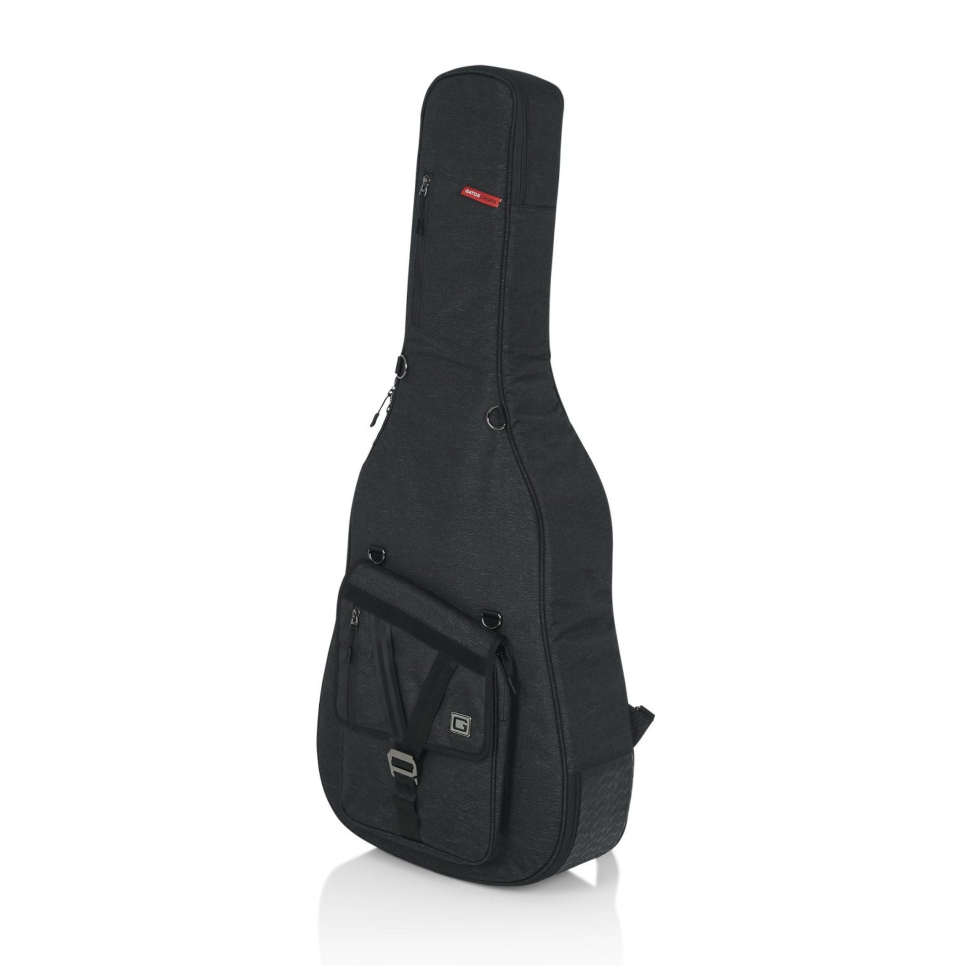 Gator’s Transit Series jumbo acoustic guitar gig bag provides rugged case-like protection without sacrificing the lightweight portability of a bag. The interior safeguards your acoustic guitar with 20mm-thick foam padding lined with soft, red micro-fleece. A removable, three-point foam block padding system cradles the headstock, neck and base of the instrument for further protection. The weather-resistant, black fabric exterior and thick rubber tread on the bottom of the bag prevents wear while shielding from the elements. A reinforced carry handle provides a comfortable grip, while the stowaway backpack straps can be unclipped and easily tucked into the rear zipper pocket. The exterior pocket on the front of the bag contains an additional smaller zipper pocket, providing ideal storage for both personal belongings and guitar accessories. Additionally, multiple d-rings are included for clipping peripheral accessories to the bag.