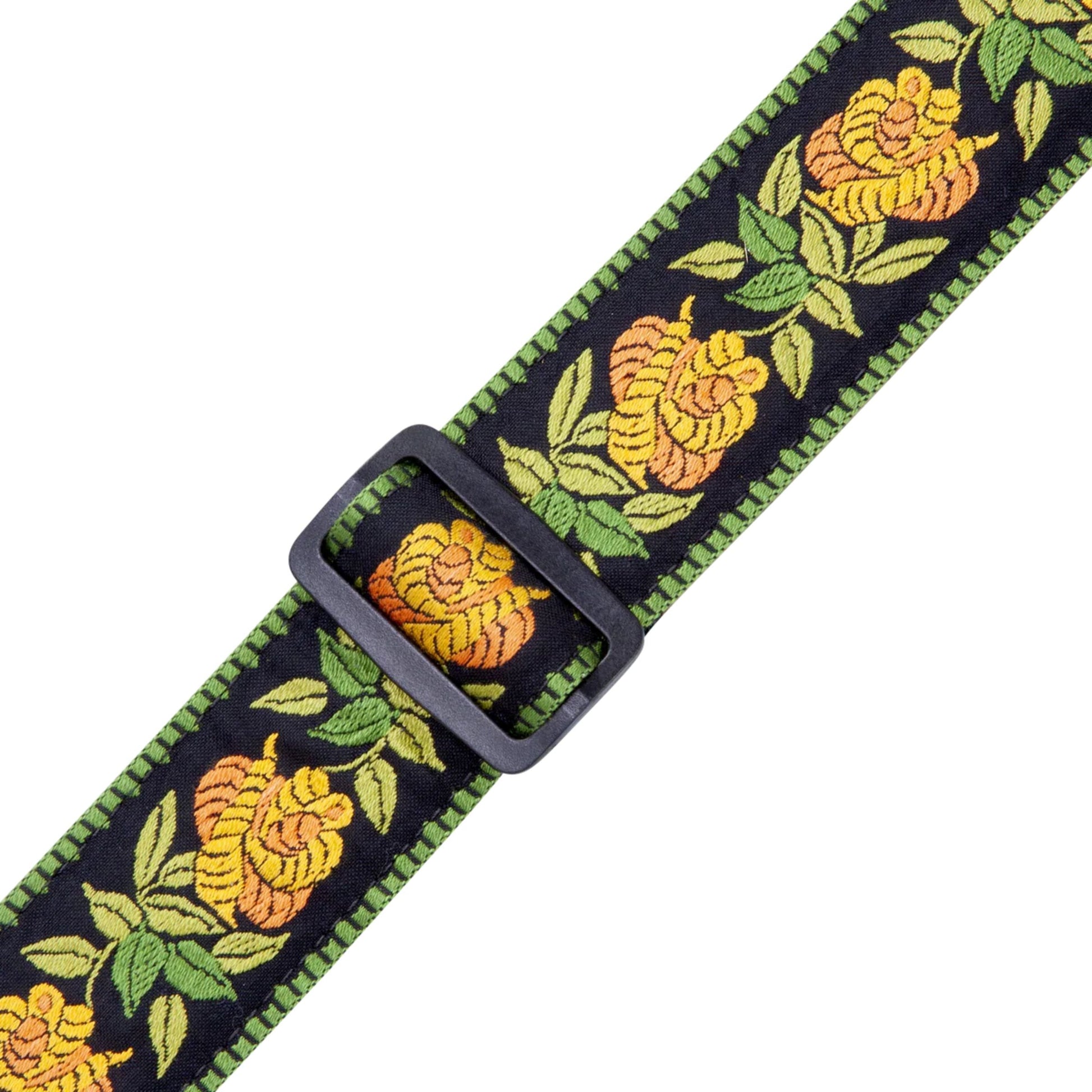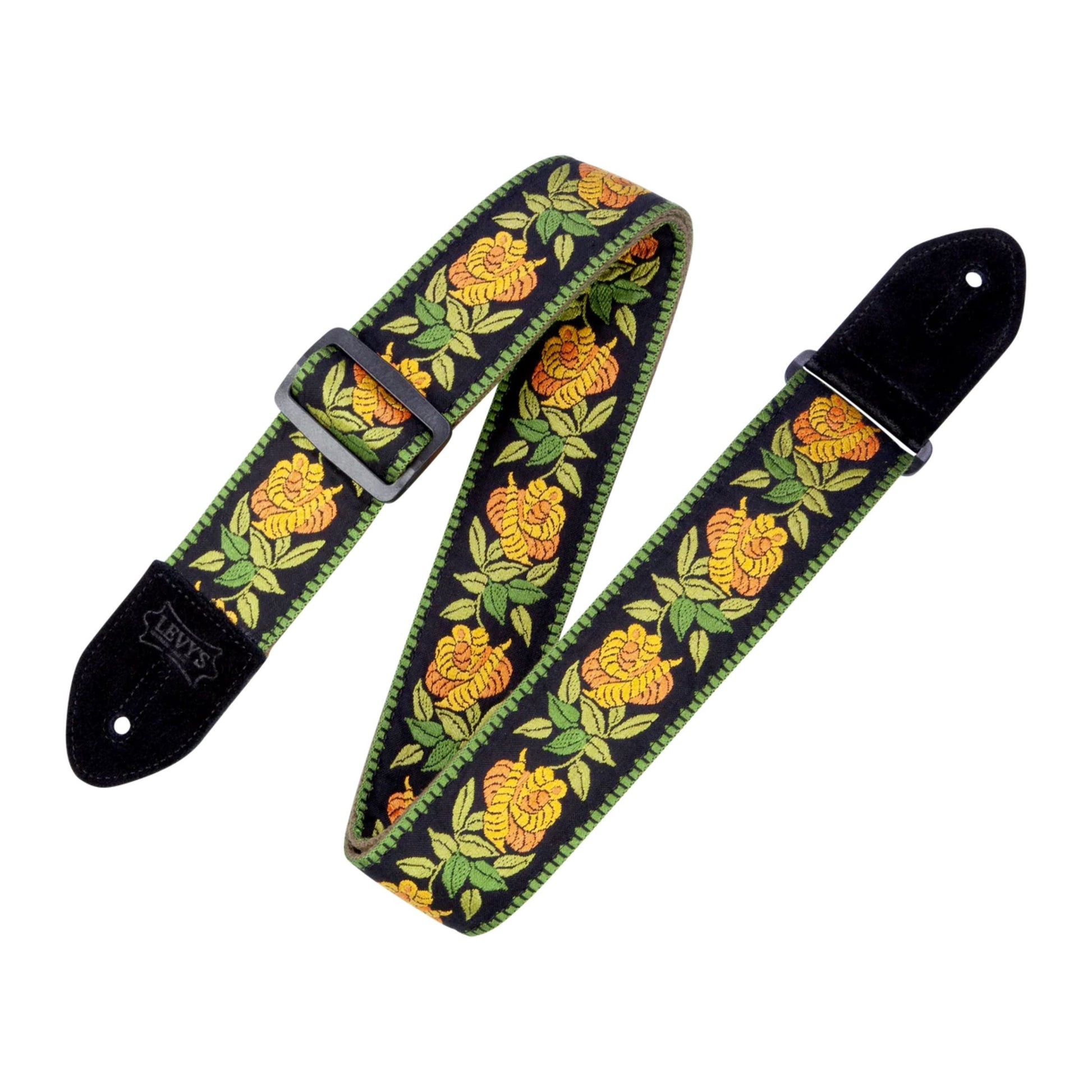 - Two-ply woven fabric guitar strap with cotton backing and suede leather leather ends. Black plastic loop and slide hardware. Adjustable from 35" to 60". Yellow floral pattern on black webbing with black suede ends.